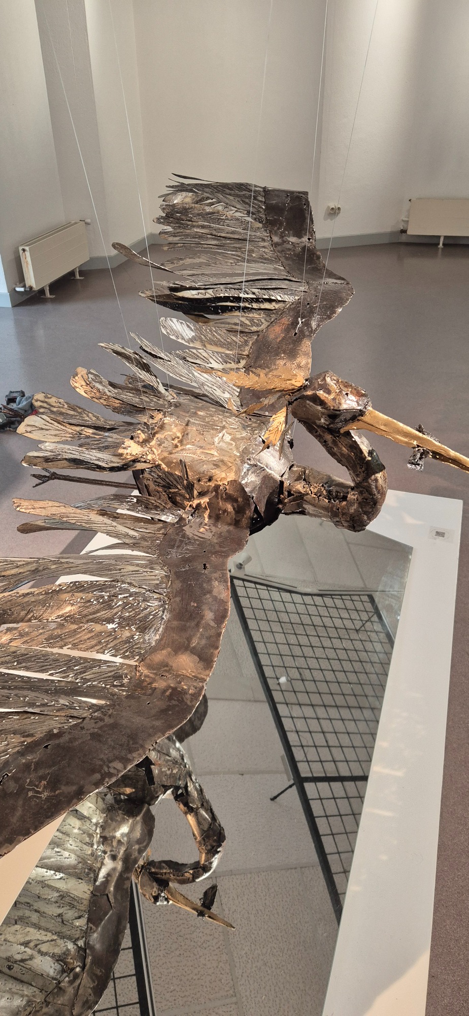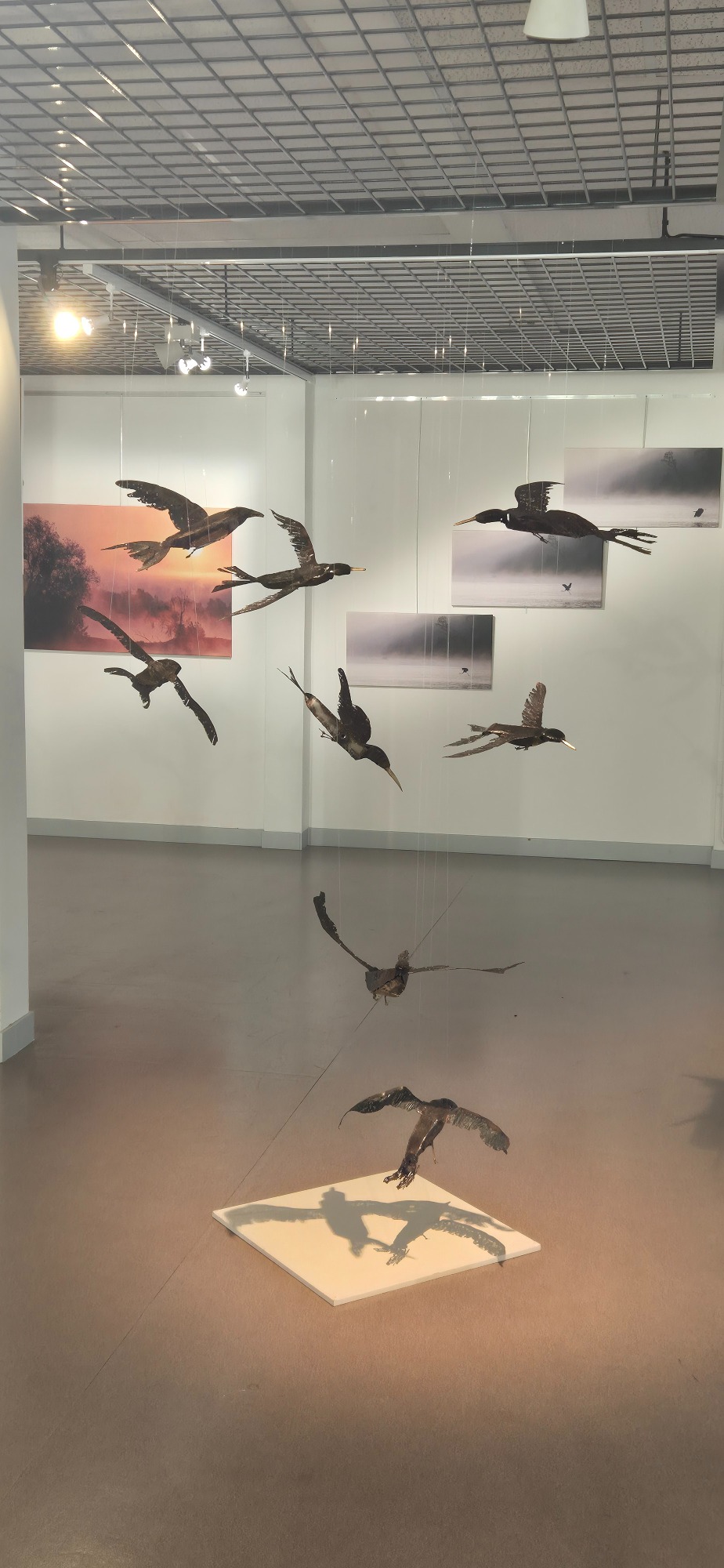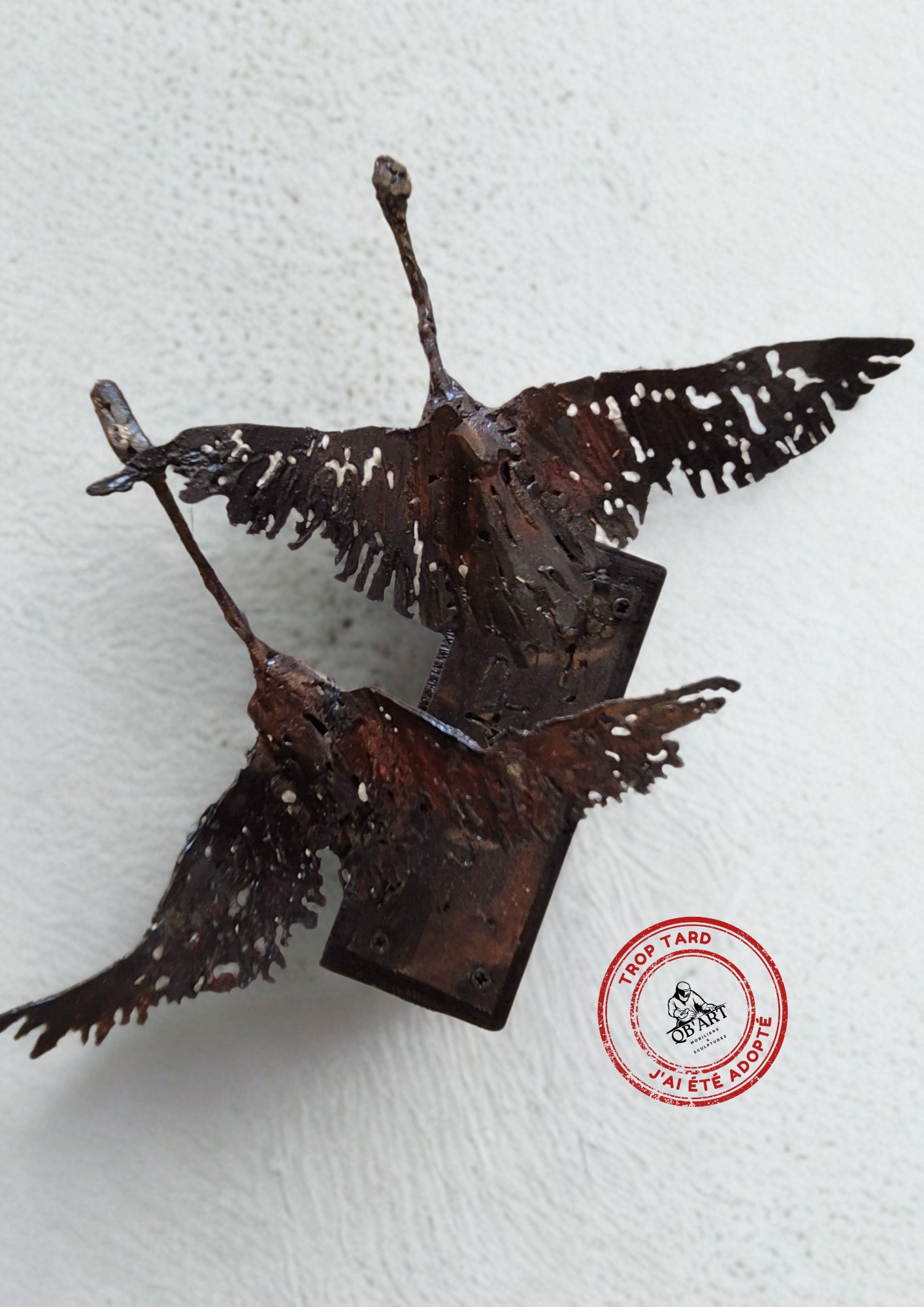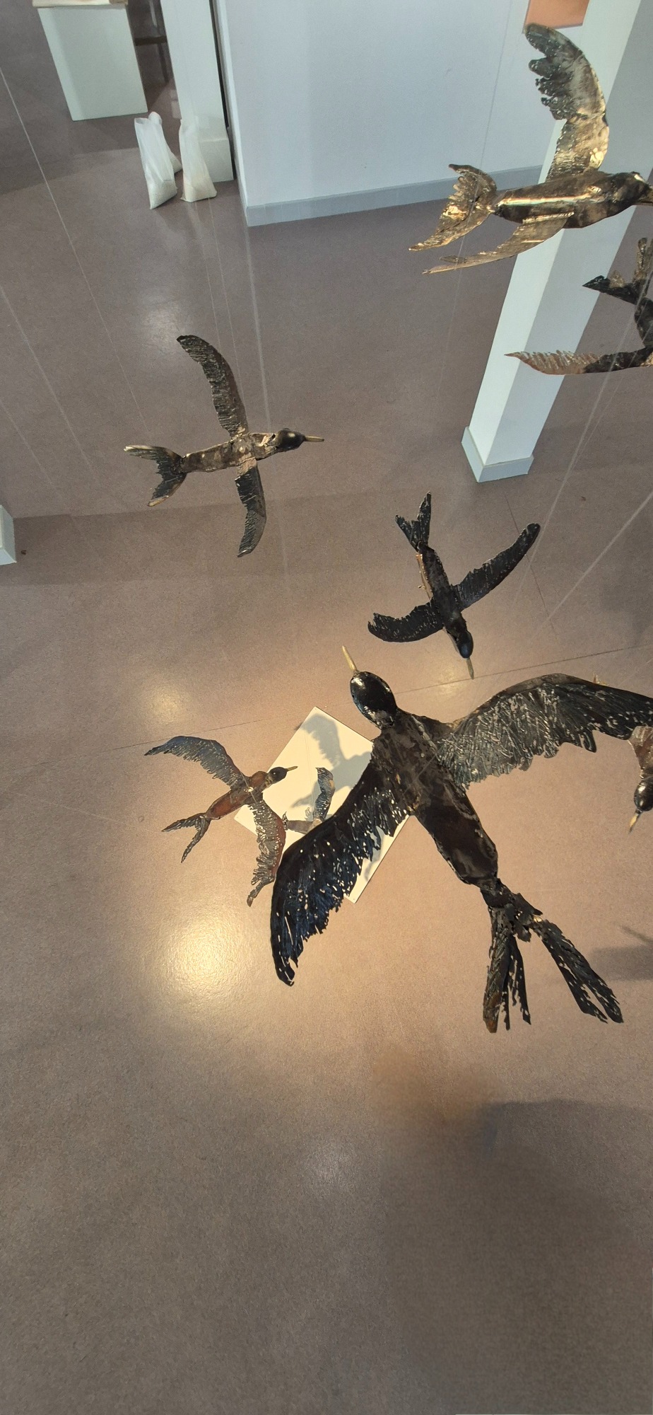 Huit sternes en acier suspendues, figées en vol, projetant leurs ombres et célébrant la liberté aérienne. Acier et patine, peinture or.