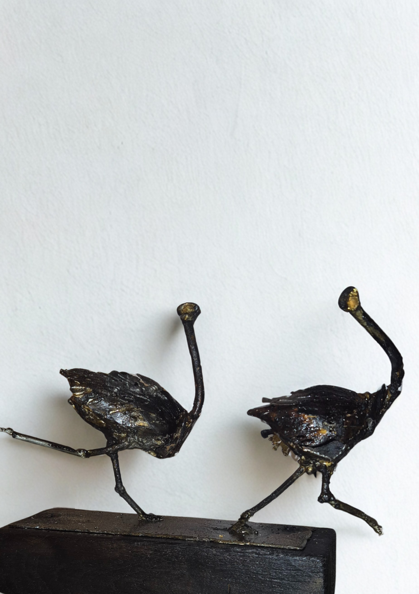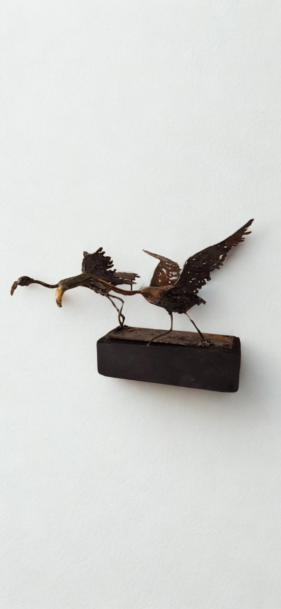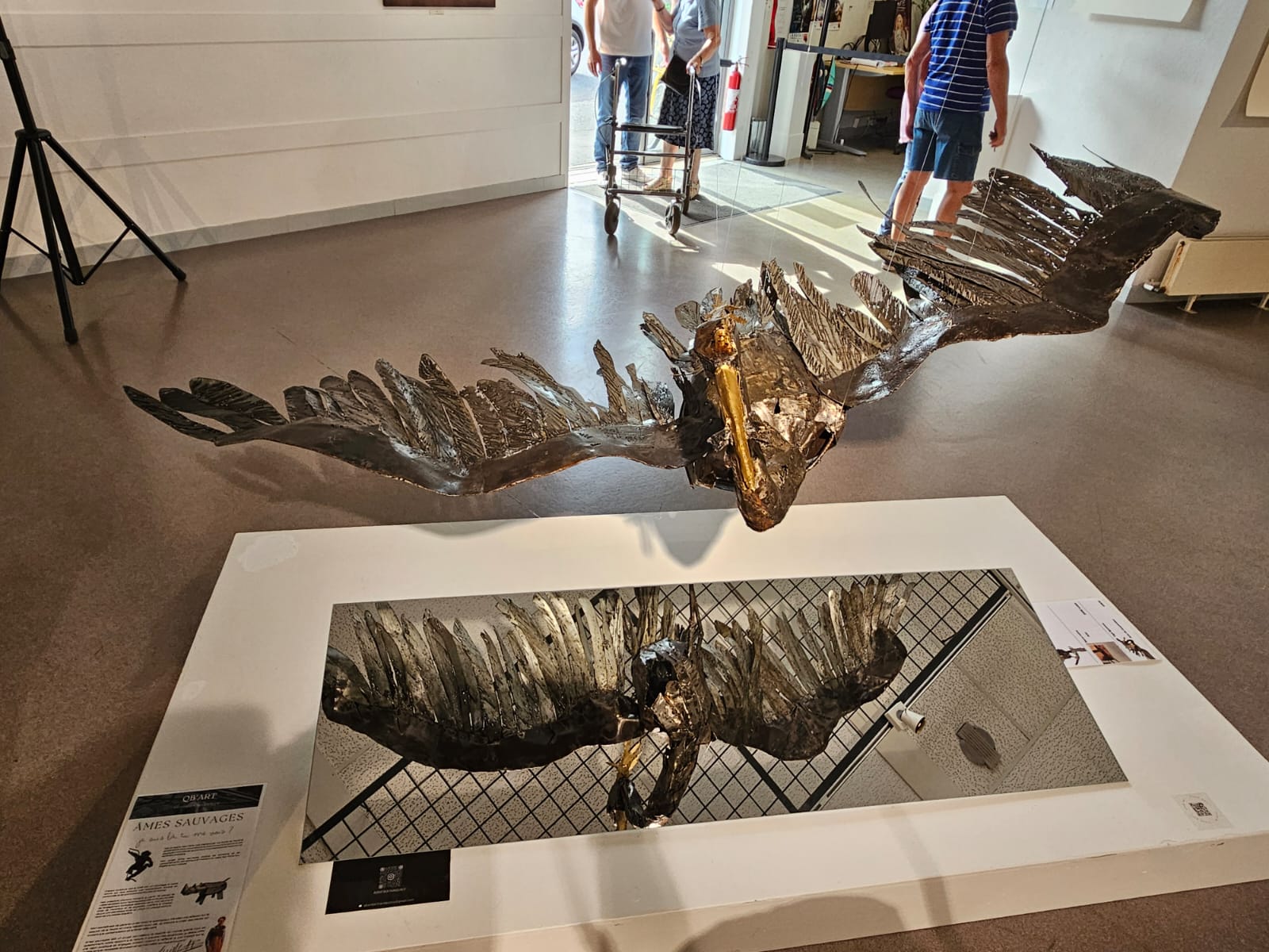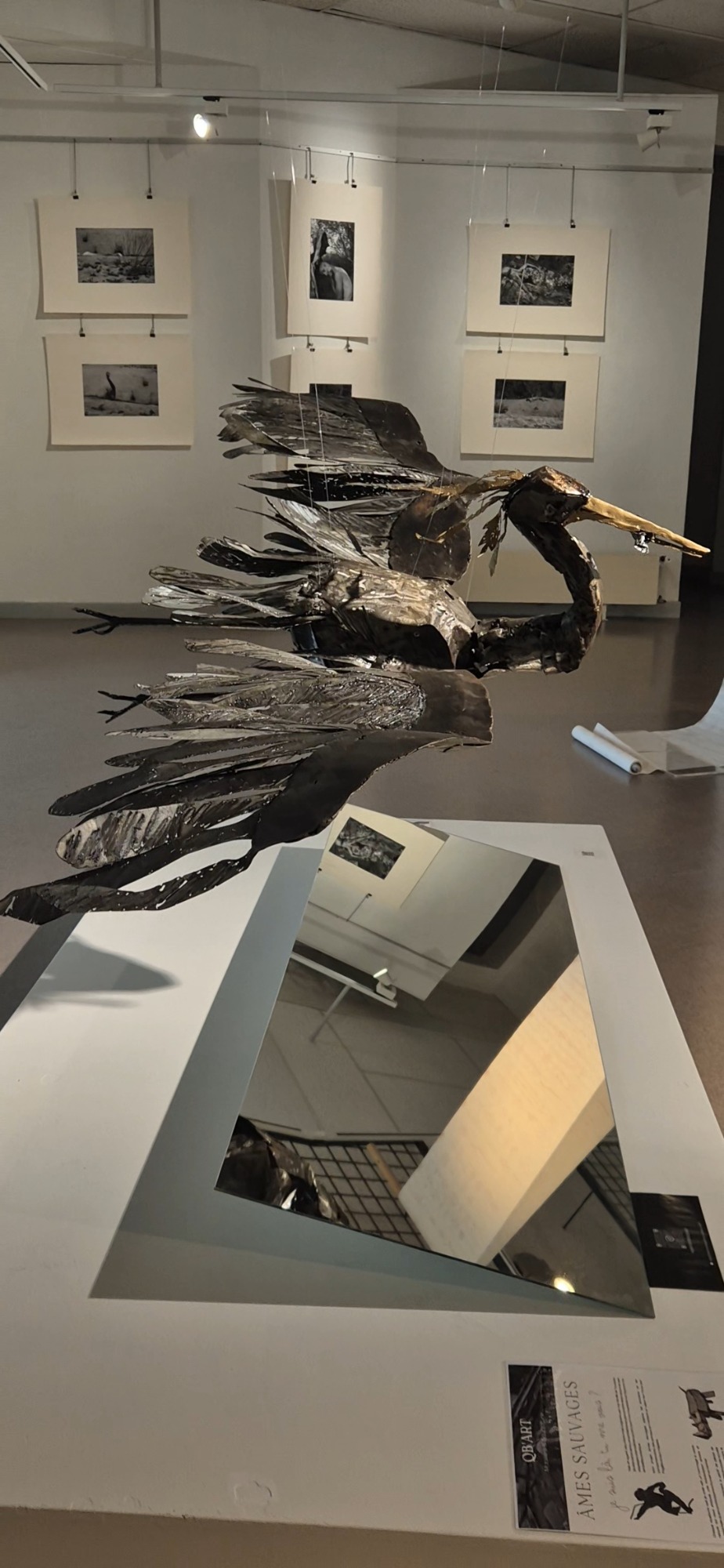 Huit sternes en acier suspendues, figées en vol, projetant leurs ombres et célébrant la liberté aérienne. Acier et patine, peinture or.